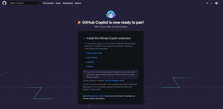 インストールが完了すると右下にポップアップが表示されます。「Copilot Settings」を押下するとブラウザに移り、以前導入の際に行ったGitHub Copilotの設定が確認できます。