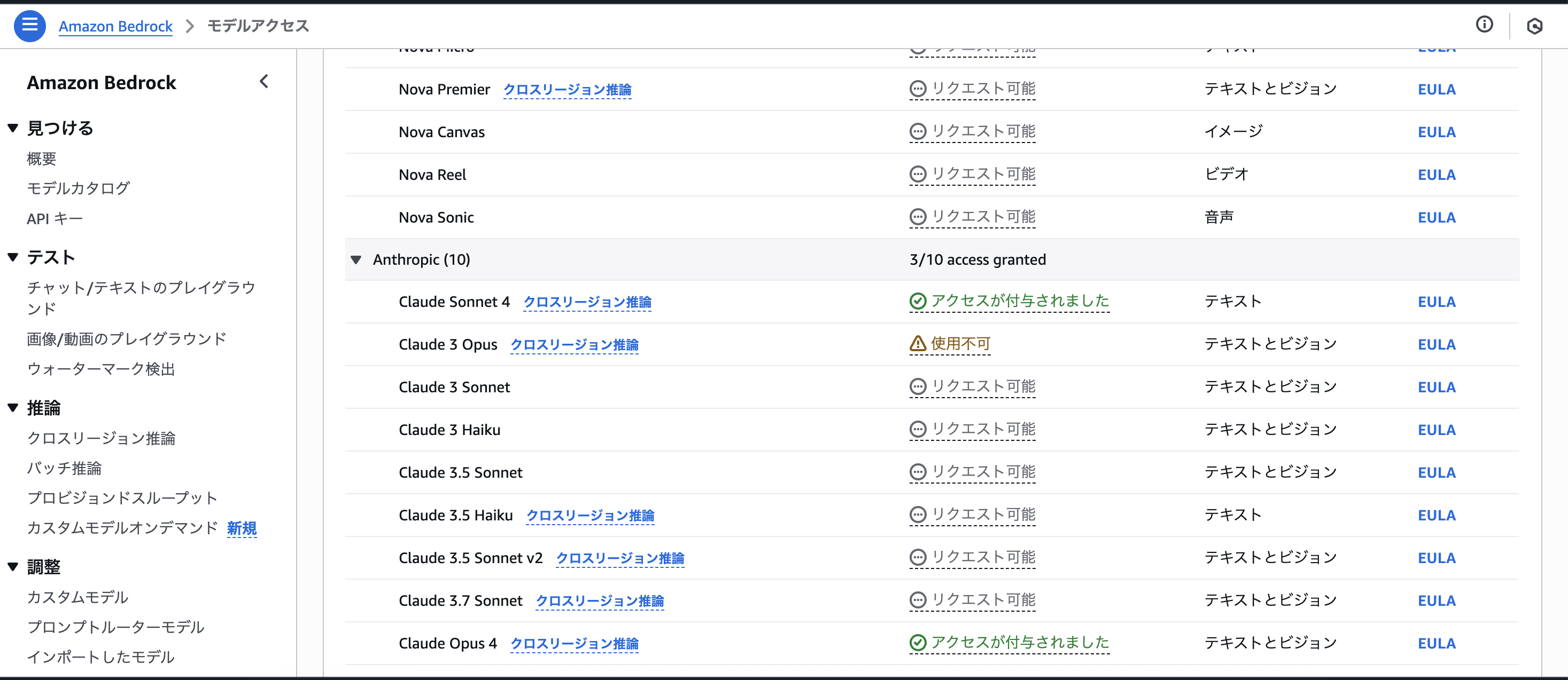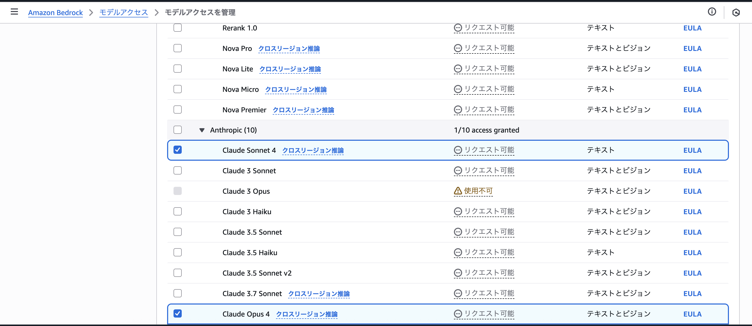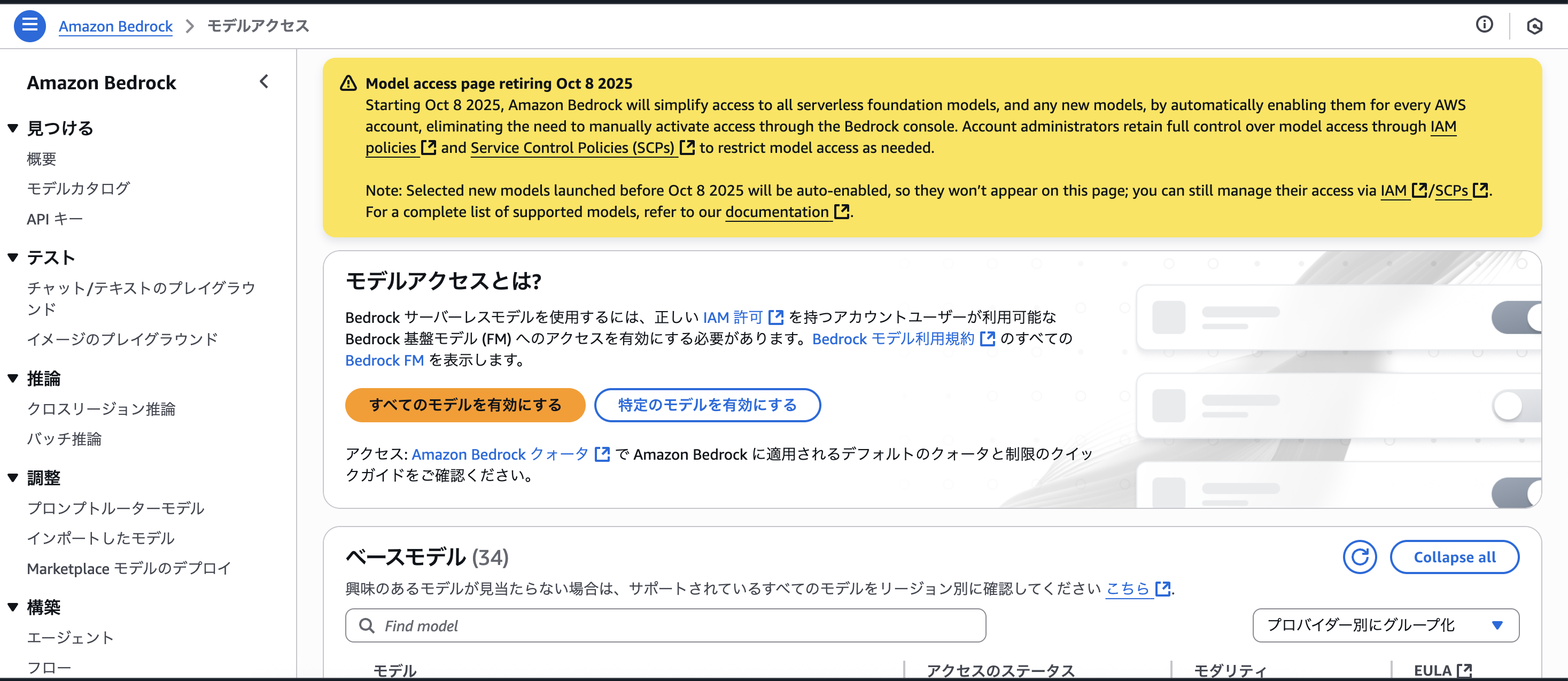- 使用するAIのモデルを選択する際、東京リージョン(ap-northeast-1)を選択すると最新のモデルが選択できません。そのため今回は最新のモデルを使用するためにバージニア北部リージョン(us-east-1)を選択し導入します。