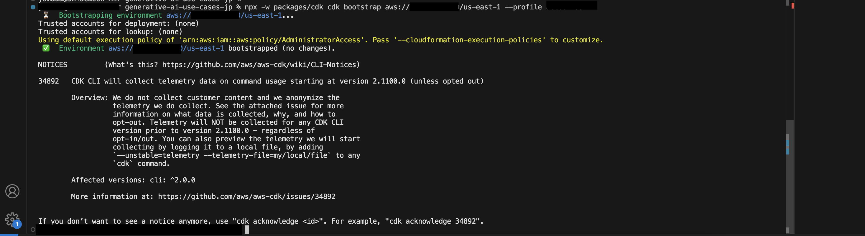 npx -w packages/cdk cdk bootstrap aws://************/us-east-1 --profile プロファイル名