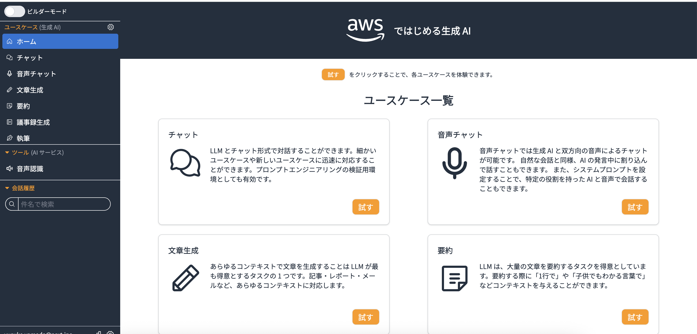 GenU(Generative AI Use Cases) は、AWS が OSS として公開する「業務でそのまま使える UI 付きの生成 AI ユースケース集」です。Amazon Bedrock を前提に、Cognito / CloudFront / API Gateway / Lambda / DynamoDB などで構成され、チャット・要約・翻訳・RAG・音声対話・エージェント・Diagram 生成 までを箱入りで提供します。製品というより 実用テンプレート で、PoC → 小規模本番までの立ち上げを一気に短縮できるのが特徴です。