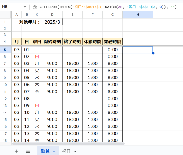 まず、H5セルに下記の関数を入力して、最下部の日付の行までコピーします。=IFERROR(INDEX('祝日'!$B$1:$B, MATCH(A5, '祝日'!$A$1:$A, 0)), "")