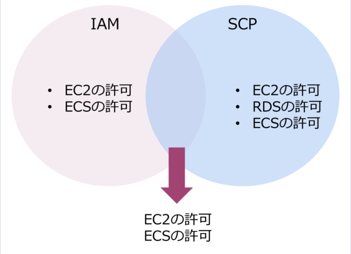 下記のようにIAMとSCP(サービスコントロールポリシー)のかさなった範囲が許可範囲になります。