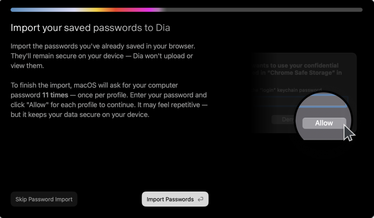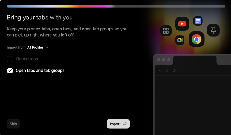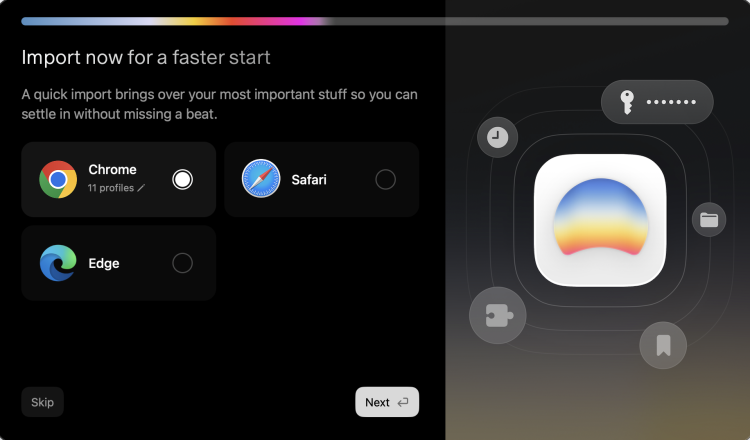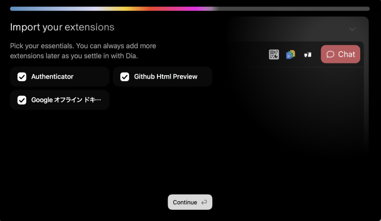 続いて以下の画面が出るので、現在メインで使用しているブラウザの情報を引き継ぎます