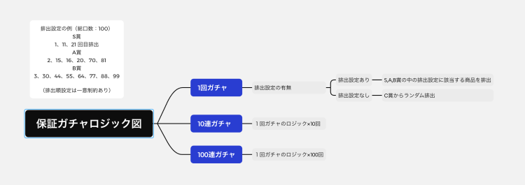 最近よく見かけるのが「保証ガチャ」です。ガチャの中で確実に当たりを出せる、保証があるロジックです。