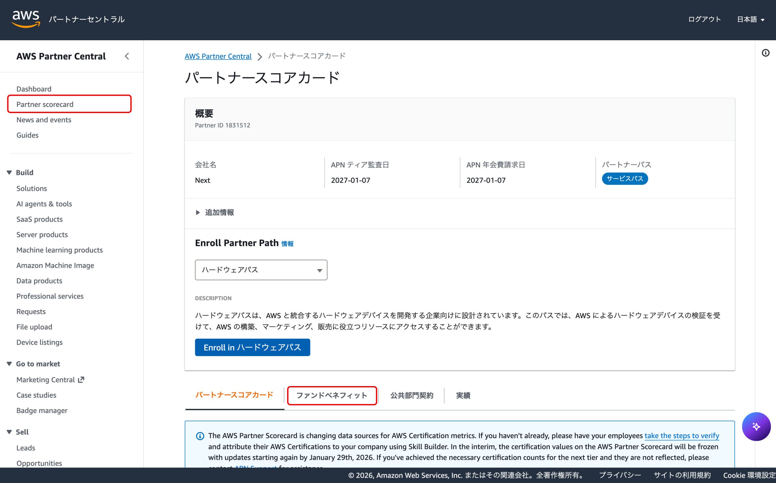 AWSコンソールからAWS Partner Centralを開き、パートナースコアカードからファンドベネフィットを確認してください。