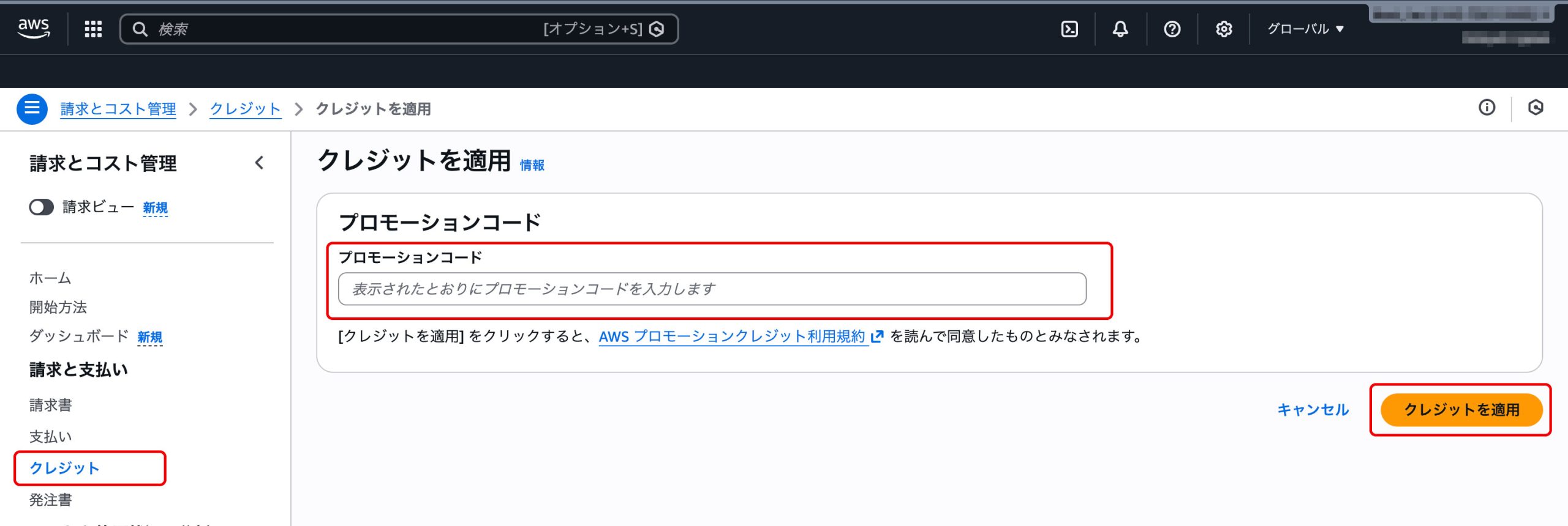 AWSプロモーションクレジットは、クーポンコードの入力が必要なケースを除いて、アカウントに付与された時点で自動適用されます。