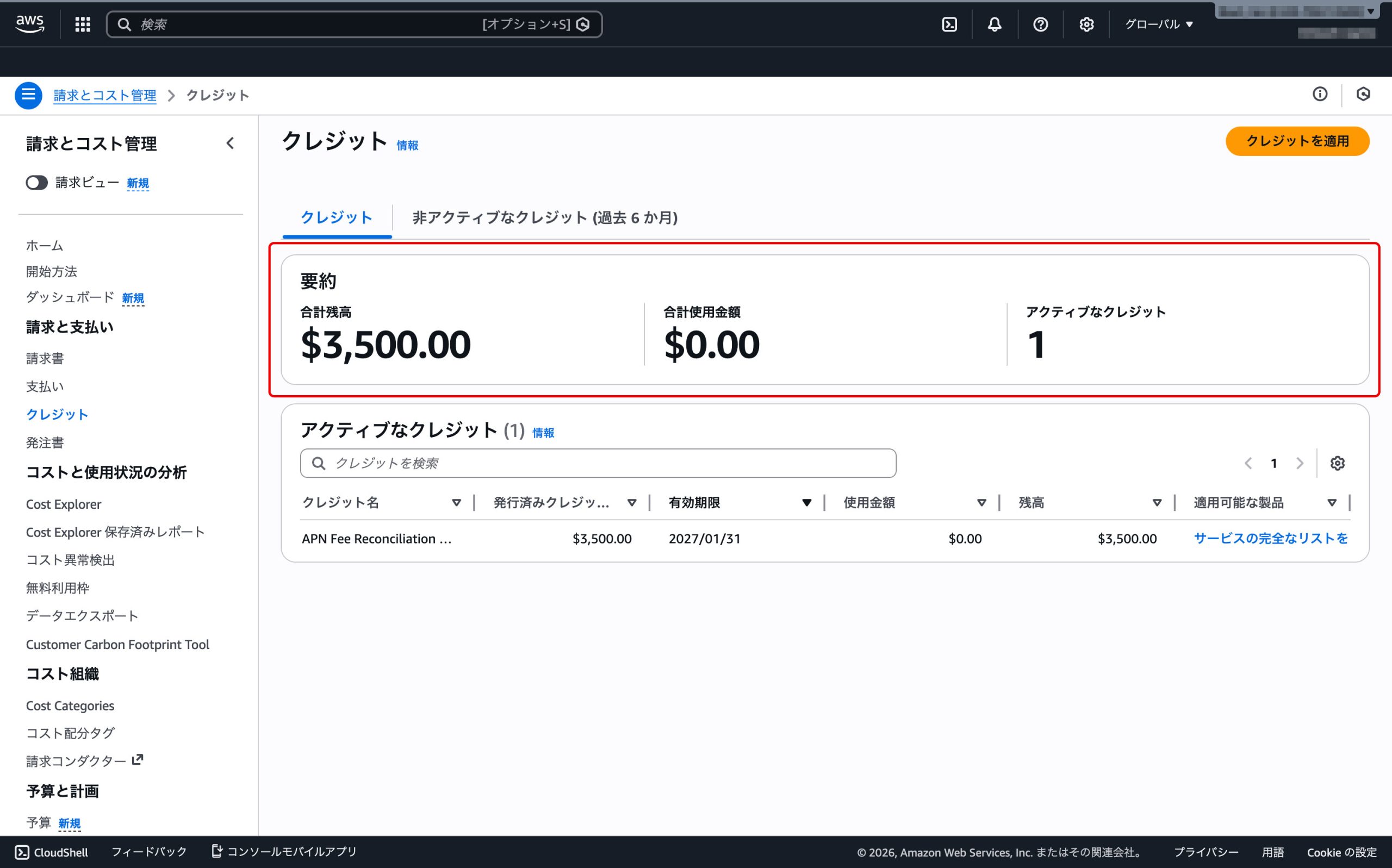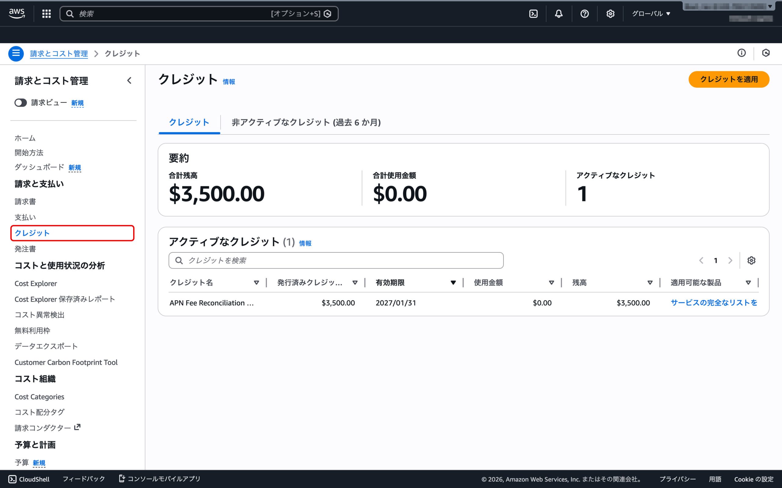 冒頭の通り、AWSクレジットは自動適用です。クレジットが適用されたか確認しておきましょう。