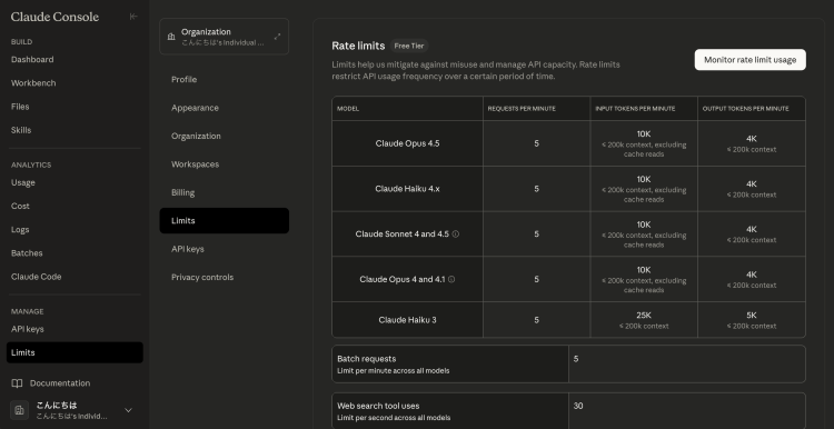 は Anthropic Console 側でしか制御できません。