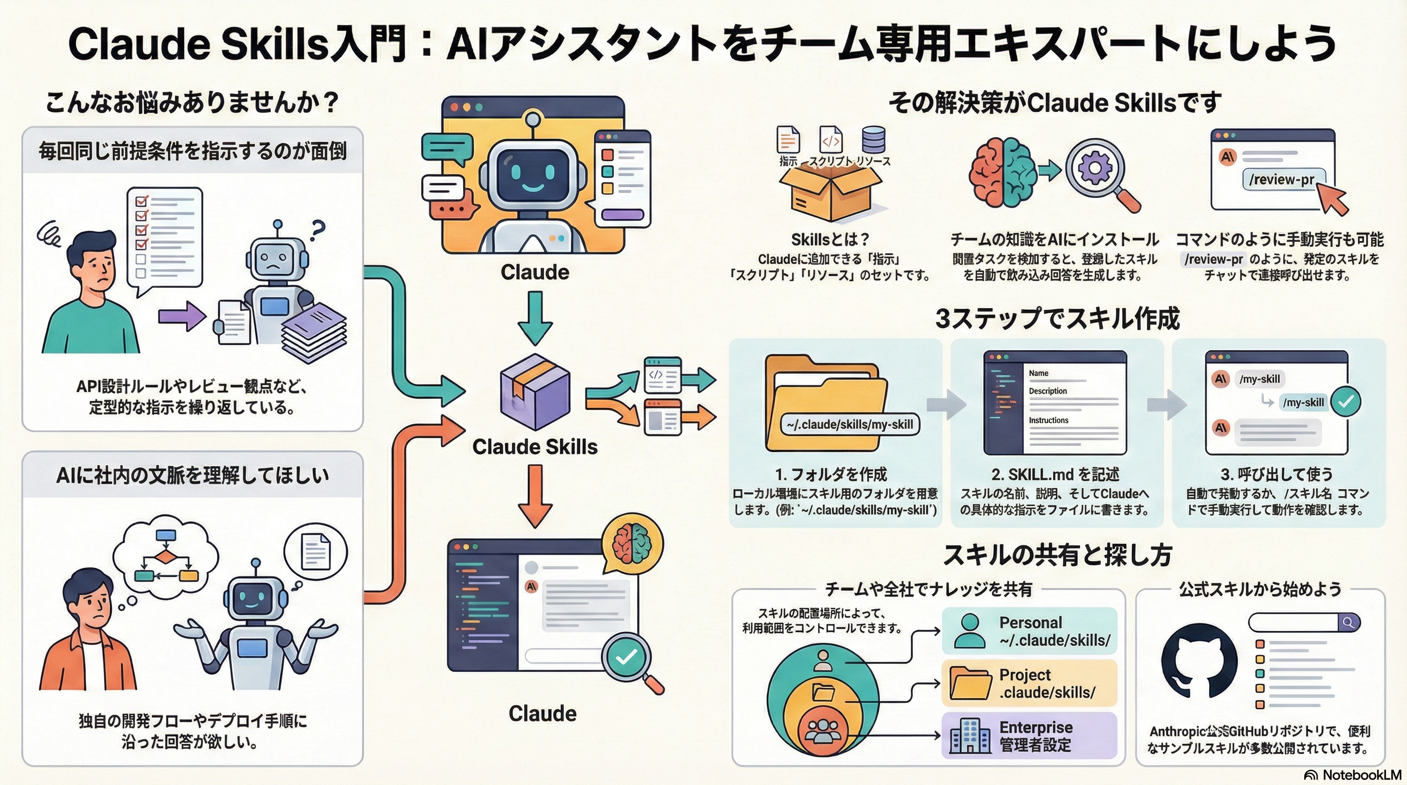 Skillsはざっくり言うと、Claudeに追加できる業務用の拡張コマンドです。社内ルールや定型作業、開発フローをスキルとして登録し、いつでも呼び出せるようにする仕組みのことです。