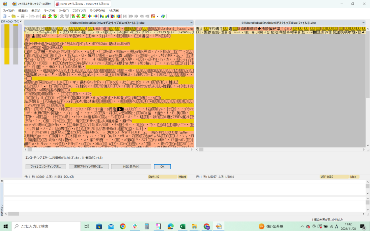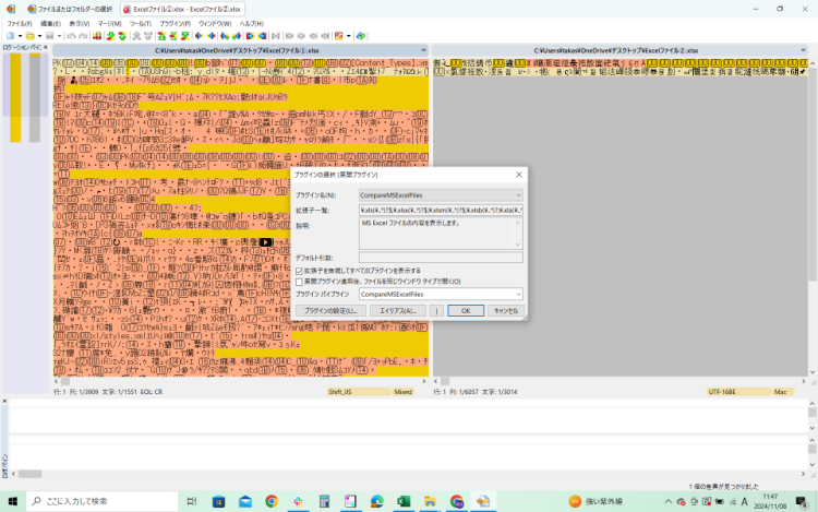 そもそもソースファイルなどを比較するために使用するのですが、Excelファイルで作成した設計書などを修正前後で比較したい時にExcelファイルを普通に差分比較しようとすると以下のように文字化けします。