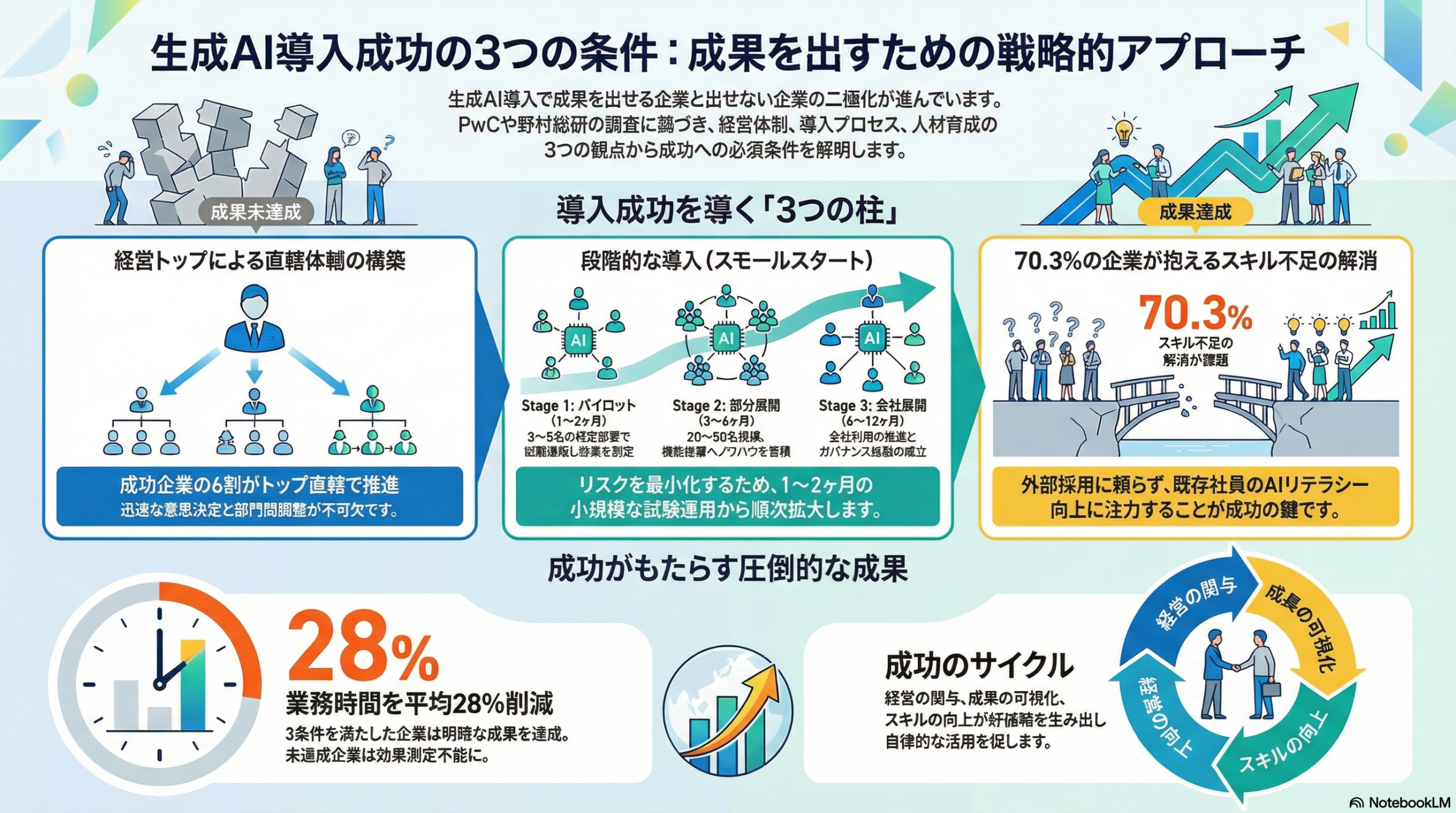 PwCの調査が示すように、導入効果は二極化しています。成功企業と失敗企業の差は、導入したかどうかではなく、どう導入したかです。