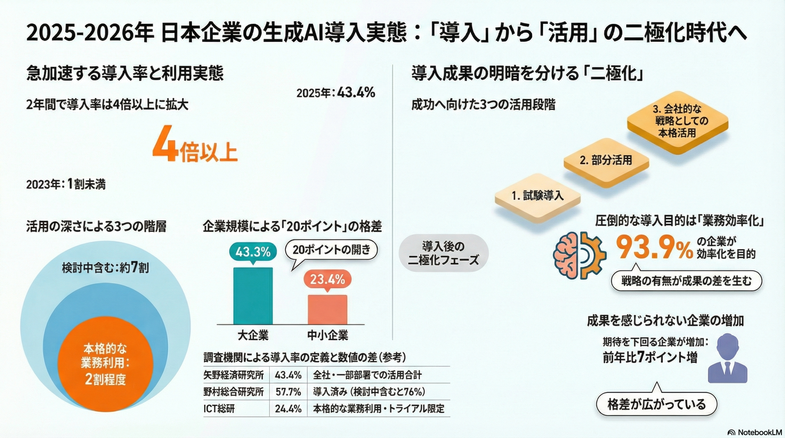 6つの調査データを見ると、導入率の定義が調査によって大きく異なることが分かります。これは、生成AIの導入がオン・オフではなく、段階的なプロセスであることを示しています。